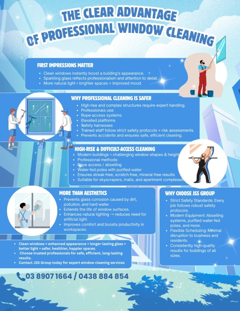 With years of experience, JSS Group has become a trusted name in professional cleaning services across Melbourne and surrounding regions. Our window cleaning team stands out for its combination of safety, skill, and reliability.